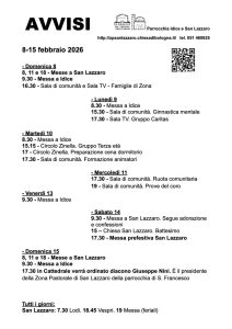 In evidenza Zona Pastorale Giuseppe Nini, di San Francesco Un nuovo diacono per la Zona Pastorale L'ordinazione il 15 febbraio. La sua testimonianza Parrocchia di S. Maria Assunta e S. Gabriele, Parrocchia di San Lazzaro Dal 19 gennaio Benedizioni pasquali 2026. Calendario e iscrizioni. Zona Pastorale Domenica 8 febbraio Family Time Parrocchia di San Francesco Un messaggio di don Giovanni La benedizione alle famiglie nell’anno di San Francesco Tutte le notizie Appuntamenti 14Febbraio ore 20:00 Parrocchia di S. Lazzaro di Savena, Volantini Cena di Carnevale 15Febbraio ore 22:00 Parrocchia di S. Lazzaro di Savena, Volantini Avvisi 8-15 febbraio Tutti gli Appuntamenti Aggiungi alla App calendario Volantini 14 Febbraio Cena di Carnevale 15 Febbraio Avvisi 8-15 febbraio tutti i volantini Le parrocchie della Zona Pastorale S. Luca Evangelista della Cicogna S. Cecilia della Croara S. Giovanni Battista di Colunga S. Salvatore di Casola Le ultime news della Zona Pastorale Il messaggio della CEI Giornata per la vita 2026 "Prima i bambini!" Pubblichiamo il Messaggio per la 48ª Giornata Nazionale per la Vita, che si celebra il 1° febbraio 2026 sul tema… > 1 Febbraio 2026 26 gennaio 2026 Zona Pastorale. Riunione del Comitato Il resoconto ZONA PASTORALE – Il 26 gennaio 2026 si è riunito il Comitato di Zona intorno al nuovo presidente Giuseppe Nini. > 30 Gennaio 2026 Incontro sulla "Dilexi te" Dio sceglie i poveri. Il video. Venerdì 23 gennaio ZONA PASTORALE – Venerdì 23 gennaio alle ore 21, nella Sala di Comunità, si è tenuto un incontro sulla “Dilexi… > 20 Gennaio 2026 Domenica 28 dicembre. A San Lazzaro non ci sarà la Messa delle ore 18. La chiusura diocesana del Giubileo La celebrazione sarà presieduta dal Cardinale Arcivescovo in San Petronio alle 16.30 Sono particolarmente invitati anche i pellegrini che in questo Anno hanno raggiunto le mete giubilari Domenica 28 dicembre alle… > 19 Dicembre 2025 Tutte le notizie della Zona Pastorale I nostri canali e link