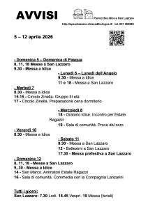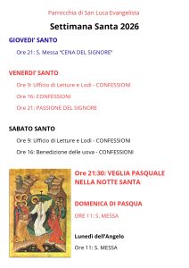 In evidenza Parrocchia di S. Maria Assunta e S. Gabriele, Parrocchia di San Lazzaro, Zona Pastorale Dal Giovedì Santo al Lunedì dell'Angelo Settimana Santa 2026: il programma a San Lazzaro e nella Zona Pastorale Il centro dell'anno liturgico Parrocchia di Santa Cecilia Pasqua 2026 Settimana Santa all’Abbazia di Santa Cecilia Croara Parrocchia di San Francesco I riti e gli orari della Settimana Santa a San Francesco d’Assisi Parrocchia di San Luca Gli orari delle celebrazioni La Settimana santa a San Luca Tutte le notizie Appuntamenti 5Aprile ore 20:00 Parrocchia di S. Lazzaro di Savena Avvisi 29 marzo-5 aprile 6Aprile ore 00:00 Parrocchia di San Francesco, Volantini La Settimana Santa a San Francesco d’Assisi 6Aprile ore 12:00 Parrocchia di San Luca, Volantini Settimana Santa a San Luca 6Aprile ore 19:00 Parrocchia di S. Lazzaro di Savena, Volantini Settimana santa 2026 Tutti gli Appuntamenti Aggiungi alla App calendario Volantini 6 Aprile La Settimana Santa a San Francesco d’Assisi 6 Aprile Settimana Santa a San Luca 6 Aprile Settimana santa 2026 12 Aprile Avvisi 5-12 aprile tutti i volantini Le parrocchie della Zona Pastorale S. Luca Evangelista della Cicogna S. Cecilia della Croara S. Giovanni Battista di Colunga S. Salvatore di Casola Le ultime news della Zona Pastorale Cinque appuntamenti, nei venerdì di Quaresima Concluse le Stazioni quaresimali 2026 Venerdì 27 marzo a San Lazzaro ZONA PASTORALE - Cinque incontri il venerdì, in altrettante parrocchie. > 27 Marzo 2026 Venerdì 13 marzo Una giornata di preghiera e digiuno per la pace L'iniziativa proposta dalla Presidenza della Conferenza Episcopale Italiana ZONA PASTORALE - Raccogliamo l'invito della CEI per una Giornata di preghiera e digiuno per la pace venerdì 13 marzo. L’invito è rivolto a tutte le comunità ecclesiali affinché chiedano al Re della Pace di salvare l’umanità dagli orrori e dalle lacrime di tutti i conflitti in corso. > 9 Marzo 2026 Domenica 15 c'è stata l'ordinazione diaconale nella Chiesa cattedrale Giuseppe Nini, un nuovo diacono nella nostra Zona Pastorale Sabato 21 festa a San Francesco d'Assisi con la prima messa come diacono ZONA PASTORALE – La prima Messa del nuovo diacono Giuseppe Nini è in programma per sabato 21 febbraio alle… > 19 Febbraio 2026 Giuseppe Nini, di San Francesco Un nuovo diacono per la Zona Pastorale L'ordinazione il 15 febbraio. La sua testimonianza ZONA PASTORALE – Con gioia la nostra Zona pastorale vive l’attesa dell’ordinazione diaconale del suo presidente, Giuseppe Nini, della parrocchia… > 3 Febbraio 2026 Tutte le notizie della Zona Pastorale I nostri canali e link