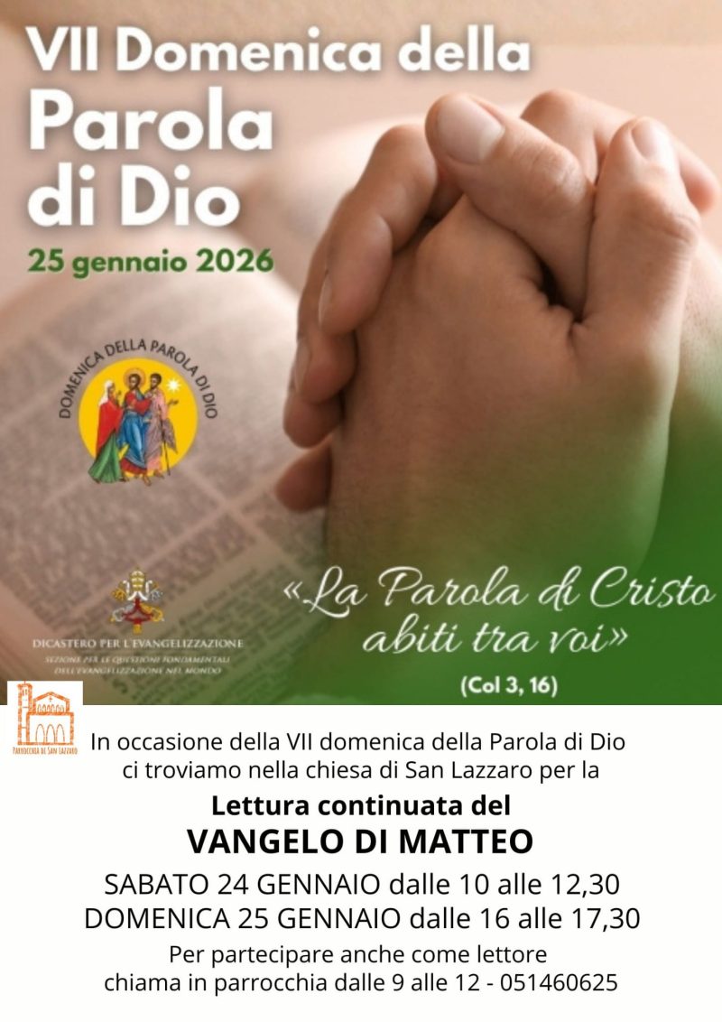 SAN LAZZARO – Celebriamo insieme la Domenica della Parola di Dio nell’ascolto del Vangelo di Matteo, che leggeremo integralmente in due incontri, sabato 24 e domenica 25 gennaio. In occasione della VII Domenica della Parola di Dio, che si celebra domenica 25 gennaio, ci ritroviamo nella chiesa di San Lazzaro per un momento speciale di ascolto e condivisione della Sacra Scrittura. Seguendo il tema proposto … Continue reading VII Domenica della Parola di Dio – Lettura continuata del Vangelo di Matteo »
