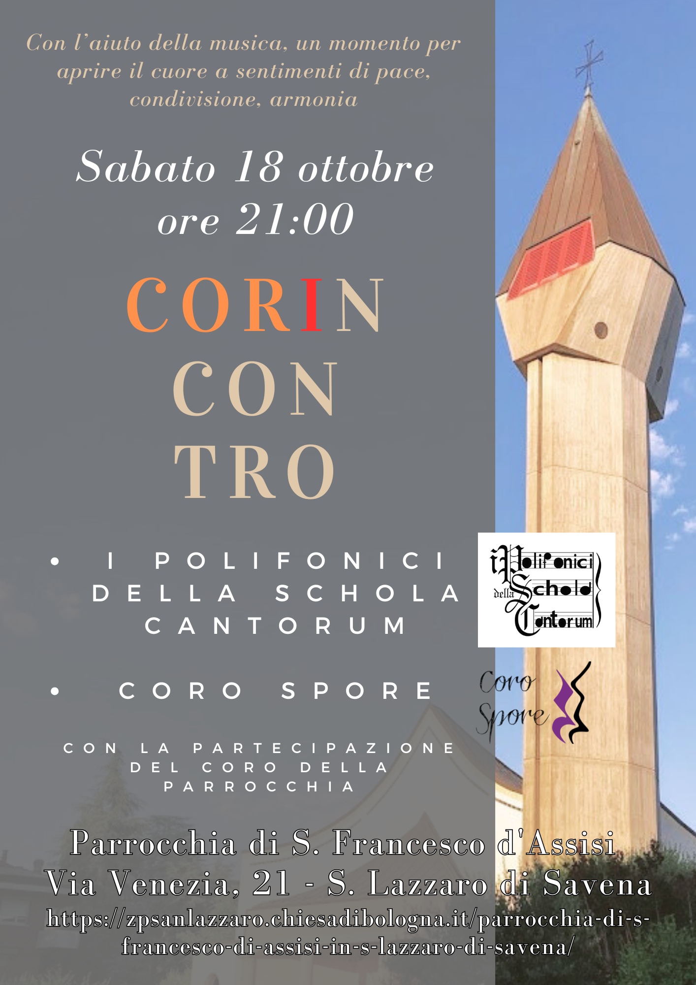 Sabato sera, 18 ottobre, potremo ascoltare una serata di musica corale; saranno presenti il Coro Spore di Bologna, diretto da Marco Lucà, e il coro I polifonici della Schola Cantorum di Ozzano dell’Emilia, diretto da Alberto Bianchi.