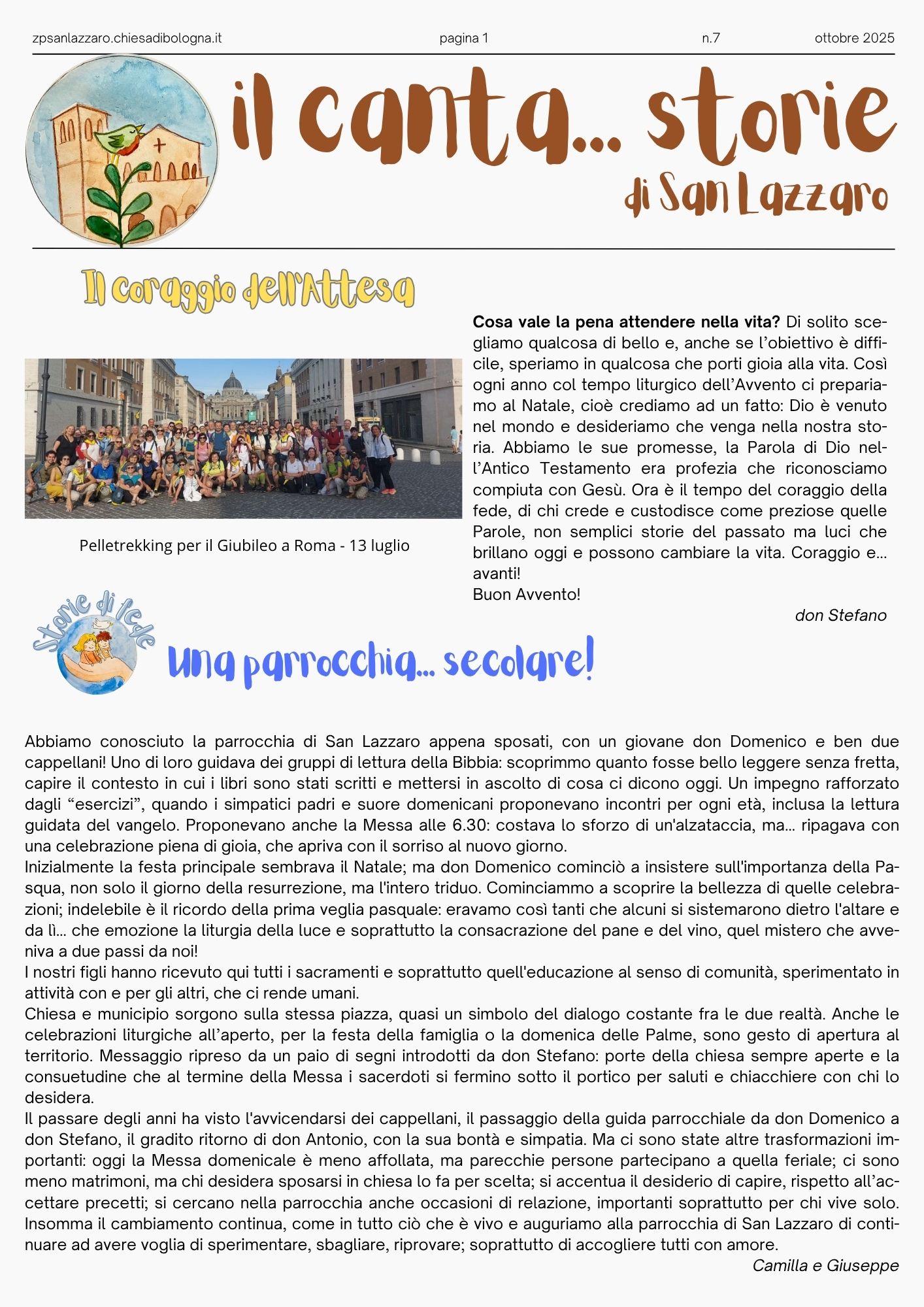 È uscito il n.7 del “Cantastorie”, il giornalino delle storie della parrocchia di San Lazzaro. Come al solito, contiene testimonianze vive delle iniziative e delle attività che si svolgono nei vari settori della parrocchia. Ognuna contribuisce a formare un quadro multicolore di una comunità dinamica e aperta. Ecco la riproduzione del giornalino, per una lettura varia e simpatica.