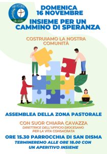 Domenica 16 novembre, nella parrocchia di San Disma, Suor Chiara Cavazza, direttrice dell’ufficio diocesano per la vita consacrata, ci aiuterà a riflettere sulle sfide che ci attendono, perché la nostra zona pastorale possa essere sempre più accogliente ed inclusiva soprattutto verso chi ancora non ci conosce, o ha un rapporto complesso con la fede e con la parrocchia.