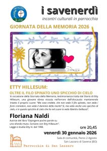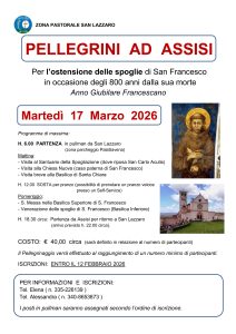 Le ultime news della Parrocchia di San Lazzaro Parrocchia di S. Maria Assunta e S. Gabriele, Parrocchia di San Lazzaro Dal 19 gennaio Benedizioni pasquali 2026. Calendario e iscrizioni. San Lazzaro e Idice. Come prenotarsi. gennaio 2026 Istantanee di Gennaio in oratorio Il primo incontro giovedì 29 gennaio Scuola della Parola Giornata della Memoria Etty Hillesum: oltre il filo spinato uno spicchio di cielo. Martedì 17 marzo Pellegrini ad Assisi. Posti esauriti. 24 e 25 gennaio VII Domenica della Parola di Dio – Lettura continuata del Vangelo di Matteo Aperta una lista di attesa. Pelletrekking a Napoli. Posti esauriti. Tutte le notizie della Parrocchia di San Lazzaro MenùHome Chi siamo Agenda Catechesi Carità Liturgia Giovani Oratorio Le foto e i video News Famiglia Gite e pellegrinaggi Incontri e approfondimenti Tutte Orari Messe San Lazzaro Feriale: 19 Sabato 9.30 + Prefestiva 17.30 Festiva: 8 – 11 – 18 I canali della Parrocchia La segreteria è aperta dal lunedì al sabato, dalle 9 alle 12. Telefono 051 460625. parrocchiasanlazzarodisavena@gmail.com