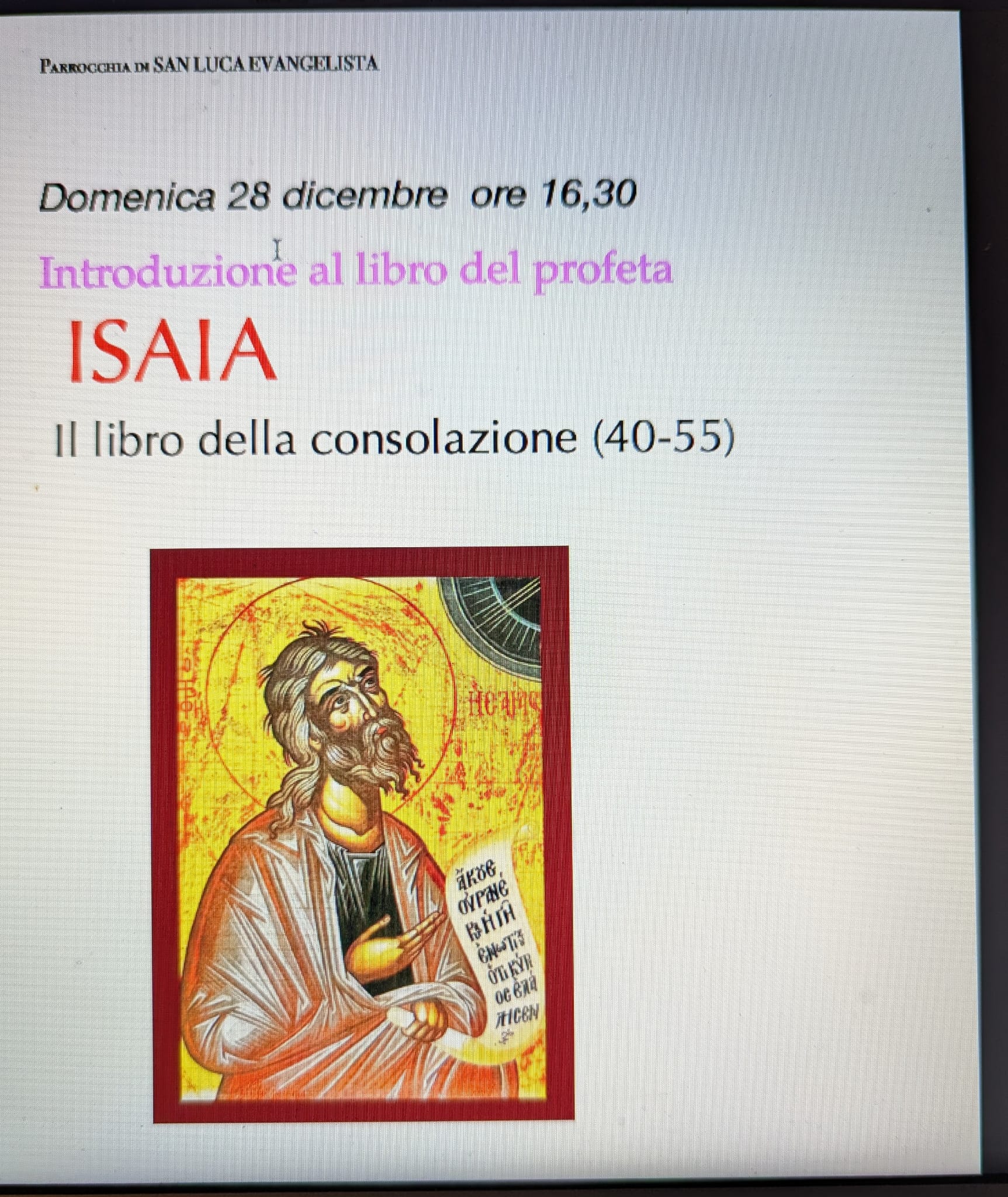 Domenica 28 dicembre, alle ore 16.30, presso la Parrocchia di San Luca Evangelista (Via Donini, 2), si terrà un incontro di approfondimento biblico dedicato al libro del profeta Isaia, guidato dal parroco don Paolo Tasini.