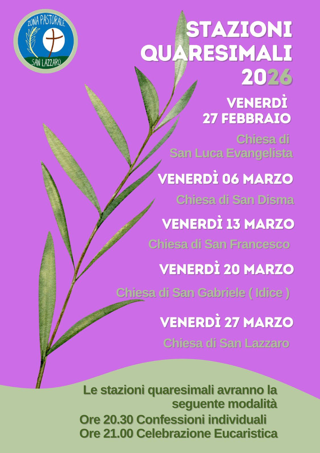 Quest’anno il programma prevede cinque incontri, nei venerdì tra il 27 febbraio e il 27 marzo, distribuiti, nell’ordine, nelle parrocchie di San Luca Evangelista (Cicogna), San Disma, San Francesco, San Gabriele (Idice) e San Lazzaro.