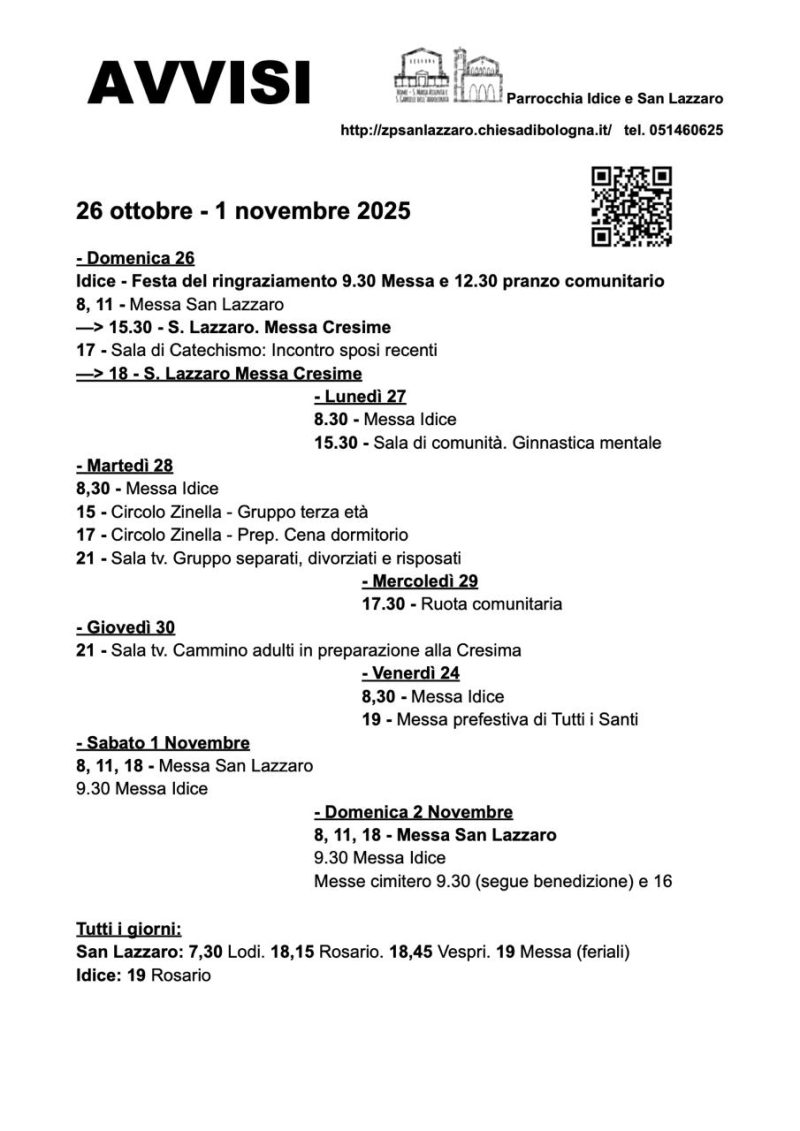 Parrocchia di S. Lazzaro di Savena, Parrocchia Santa Maria Assunta e San Gabriele, Volantini 26 Ottobre 2025 domenica 2 Novembre 22:00 Avvisi 26 ottobre – 2 novembreInizio: 02/11/2025 22:00