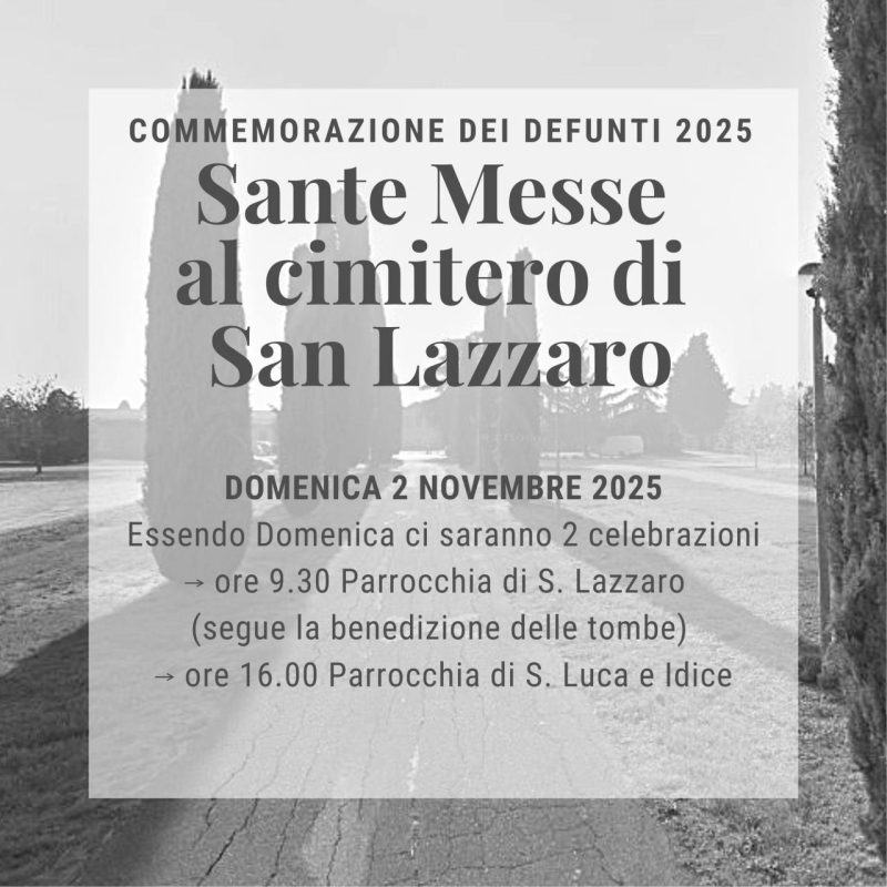 Parrocchia di S. Lazzaro di Savena, Parrocchia di San Luca, Parrocchia Santa Maria Assunta e San Gabriele, Volantini 26 Ottobre 2025 domenica 2 Novembre 18:00 2 novembre. Messe al cimiteroInizio: 02/11/2025 18:00