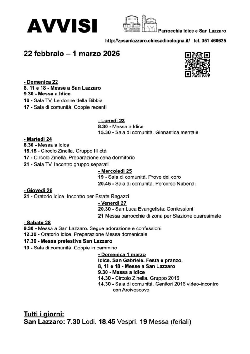 Parrocchia di S. Lazzaro di Savena, Volantini 21 Febbraio 2026 Avvisi 22 febbraio – 1 marzo domenica 1 Marzo Descrizione: Avvisi 22 febbraio – 1 marzo Inizio: 01/03/2026 22:00 Fine: 01/03/2026 22:00 Categorie: Parrocchia di S. Lazzaro di Savena, Volantini