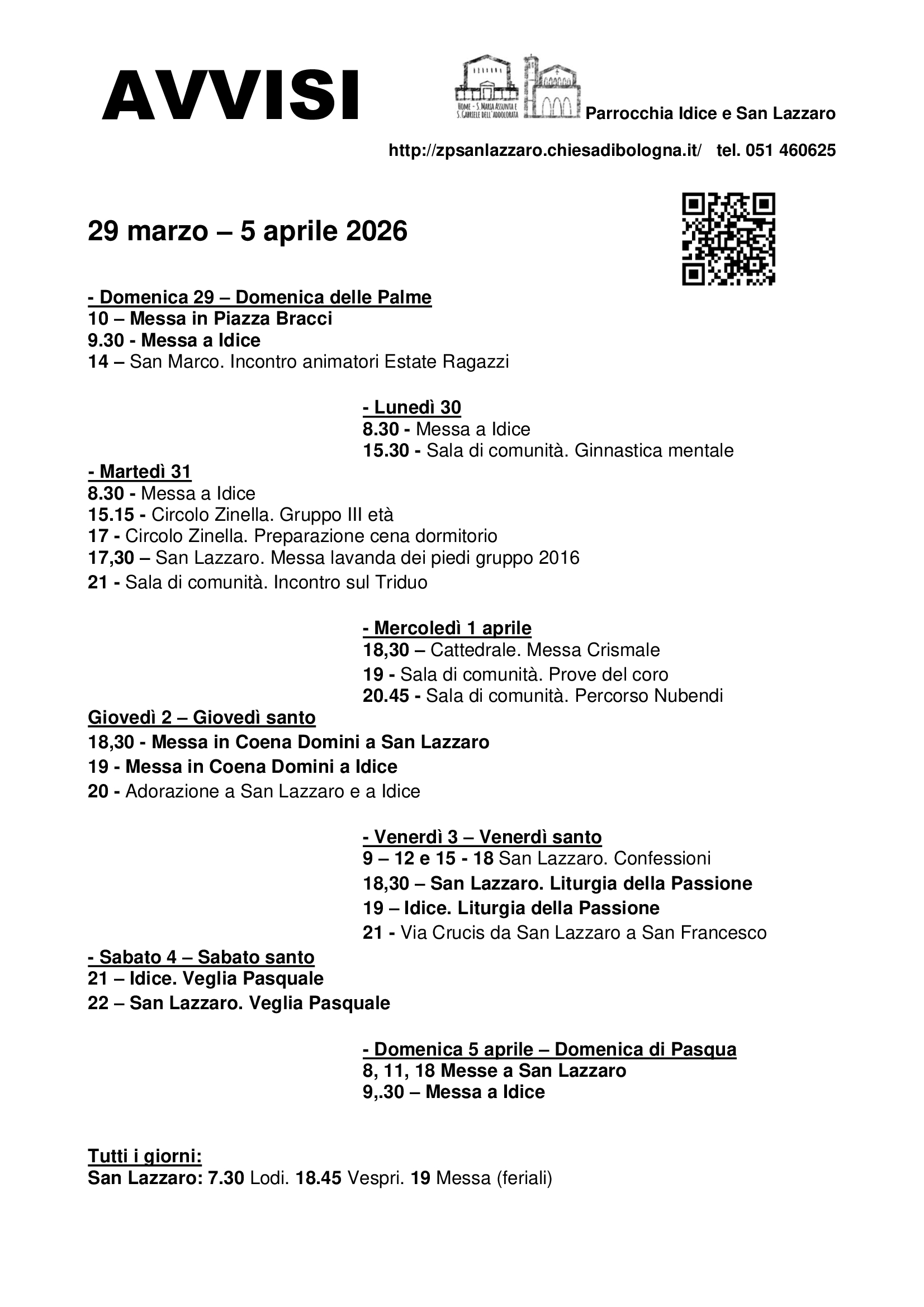 Parrocchia di S. Lazzaro di Savena, Volantini 28 Marzo 2026 Avvisi 29 marzo-5 aprile domenica 5 Aprile Descrizione: Avvisi 29 marzo-5 aprile Inizio: 05/04/2026 20:00 Fine: 05/04/2026 20:00 Categorie: Parrocchia di S. Lazzaro di Savena, Volantini