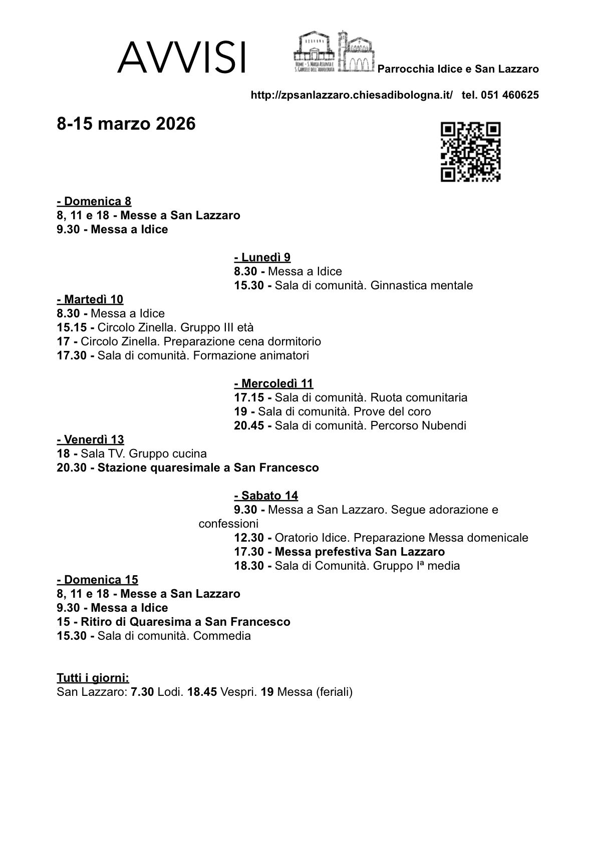 Parrocchia di S. Lazzaro di Savena 8 Marzo 2026 Avvisi 8-15 marzo domenica 15 Marzo Descrizione: Avvisi 8-15 marzo Inizio: 15/03/2026 22:00 Fine: 15/03/2026 22:00 Categorie: Parrocchia di S. Lazzaro di Savena