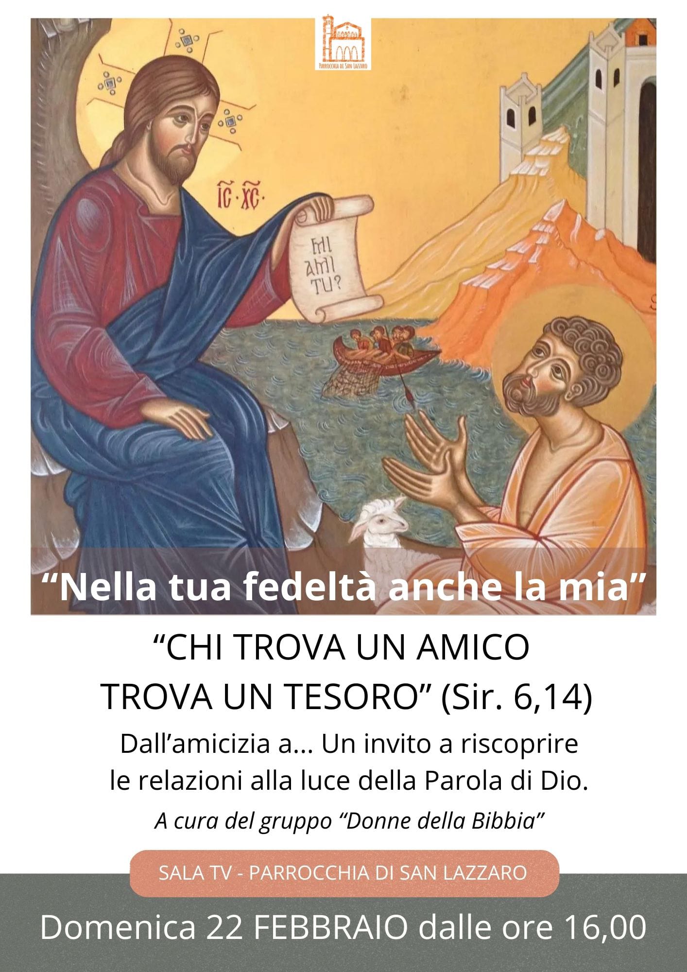 Parrocchia di S. Lazzaro di Savena, Volantini 16 Febbraio 2026 Chi trova un amico trova un tesoro domenica 22 Febbraio Descrizione: Chi trova un amico trova un tesoro. Gruppo “Donne della Bibbia”. Inizio: 22/02/2026 16:00 Fine: 22/02/2026 18:59 Categorie: Parrocchia di S. Lazzaro di Savena, Volantini