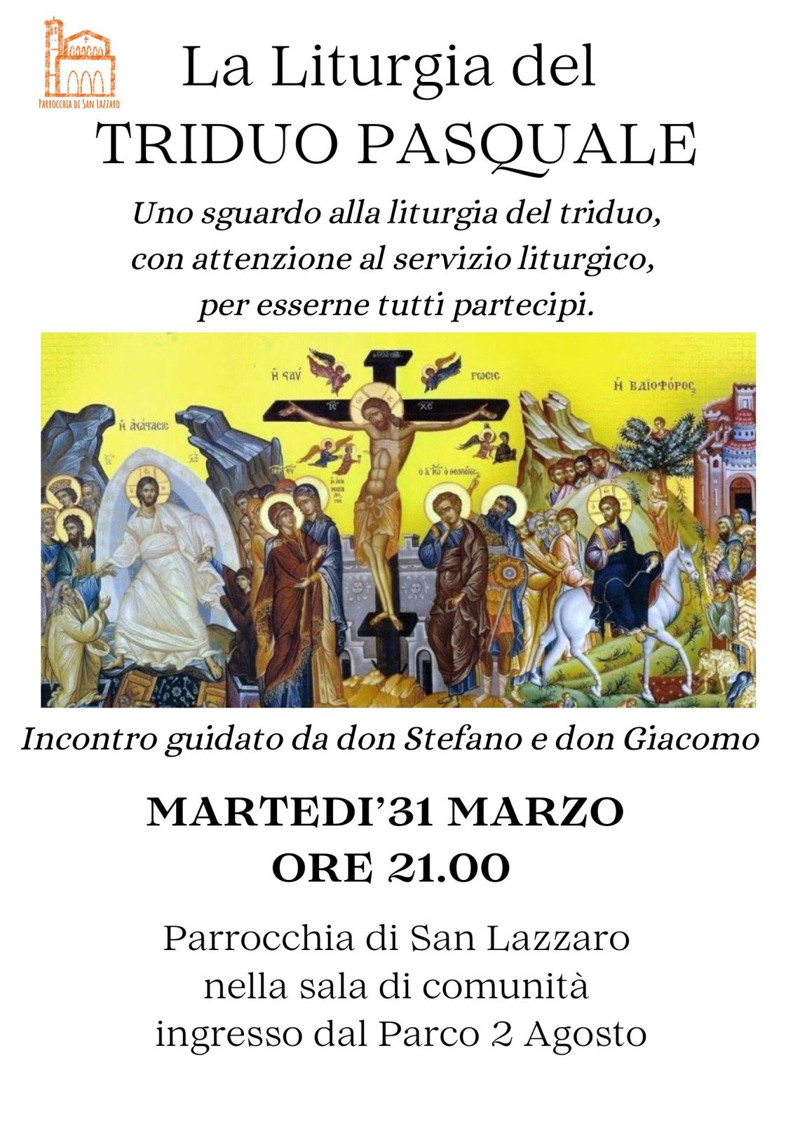 Parrocchia di S. Lazzaro di Savena, Volantini 29 Marzo 2026 I riti del Triduo martedì 31 Marzo Descrizione: I riti del Triduo Inizio: 31/03/2026 21:00 Fine: 31/03/2026 21:00 Categorie: Parrocchia di S. Lazzaro di Savena, Volantini