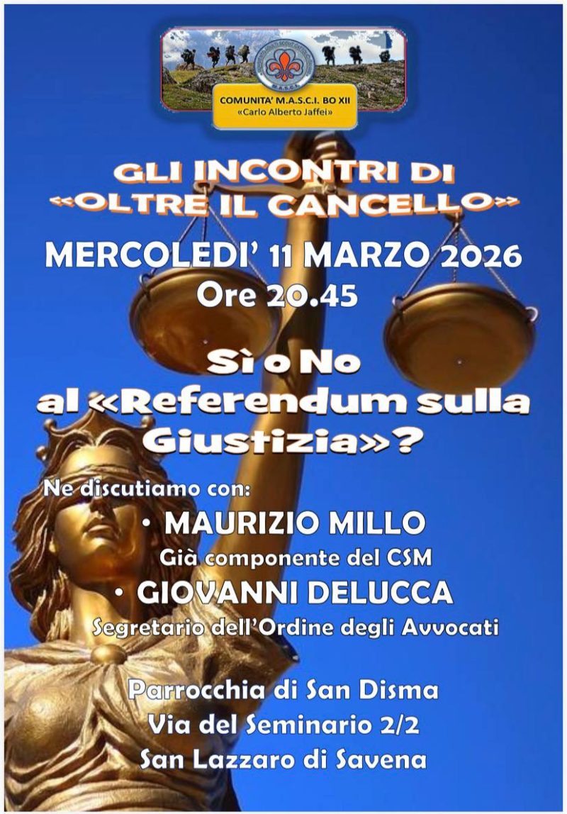 Parrocchia di San Lorenzo, Parrocchia di San Salvatore, Volantini 8 Marzo 2026 Incontro a San Disma sul referendum mercoledì 11 Marzo Descrizione: Incontro a San Disma sul referendum Inizio: 11/03/2026 20:45 Fine: 11/03/2026 23:00 Categorie: Parrocchia di San Lorenzo, Parrocchia di San Salvatore, Volantini