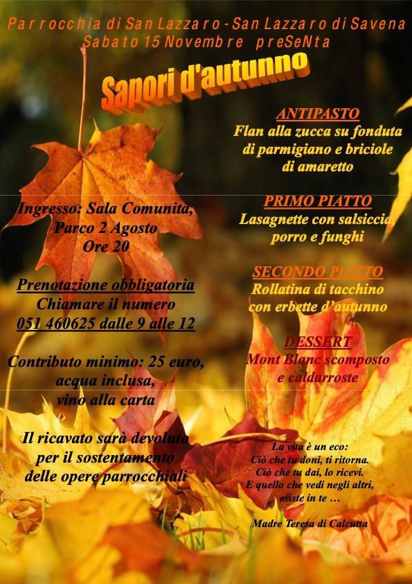 Parrocchia di S. Lazzaro di Savena, Volantini 4 Novembre 2025 Sapori d’autunno sabato 15 Novembre Descrizione: Sapori d’autunno Inizio: 15/11/2025 20:00 Fine: 15/11/2025 22:00 Categorie: Parrocchia di S. Lazzaro di Savena, Volantini
