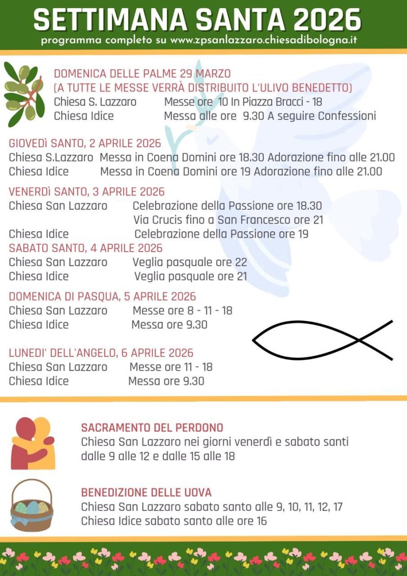 Parrocchia di S. Lazzaro di Savena, Volantini 24 Marzo 2026 Settimana santa 2026 lunedì 6 Aprile Descrizione: Settimana santa 2026. Tutto il programma. Inizio: 06/04/2026 19:00 Fine: 06/04/2026 19:00 Categorie: Parrocchia di S. Lazzaro di Savena, Volantini
