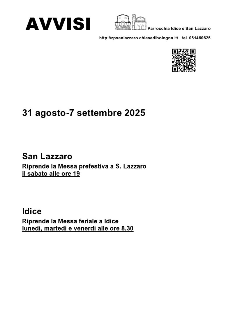 Parrocchia di S. Lazzaro di Savena, Volantini 19 Luglio 2025 venerdì 1 Agosto 23:00 Attenzione! Dal 28 luglio al 1 agosto la Messa feriale a San Lazzaro è alle ore 8.Inizio: 01/08/2025 23:00