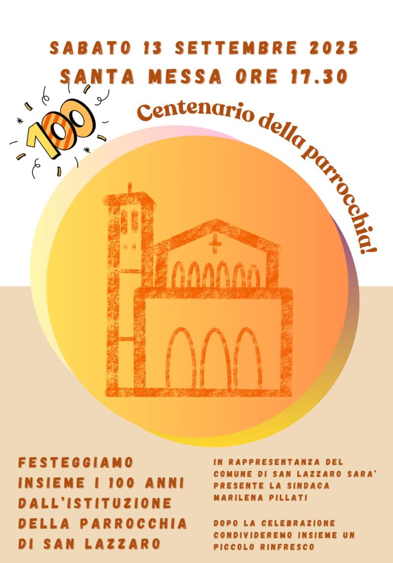 Parrocchia di S. Lazzaro di Savena, Volantini, Zona Pastorale 4 Settembre 2025 sabato 13 Settembre 17:30 Centenario della parrocchia!Inizio: 13/09/2025 17:30