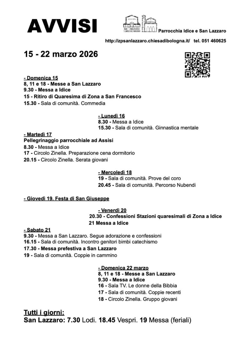 Parrocchia di S. Lazzaro di Savena, Parrocchia Santa Maria Assunta e San Gabriele 14 Marzo 2026 domenica 22 Marzo 22:00 Avvisi 15-22 marzoInizio: 22/03/2026 22:00